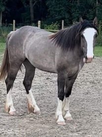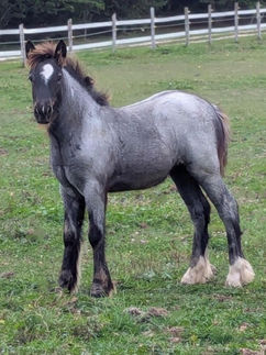 5-year-old smoky blue roan mare. E/e N/Cr N/TO Rn/n by Ricochet (see on stallions page) & our imported SD mare, Feathered Acres Bella (above). Pictured from 2 to 5 yrs old. 14.1+ hands. pssm1 negative. Lexi is well put together with great feather like her mama. She has the best personality I've ever seen. Her first foal in 2025 was a blue roan filly built like a little tank with a personality to die for. Bred back to Ash our 2022 grulla gypsy stallion for May 2026. See Ash (Clarion call Notorious) on our stallion's page. Lexi & Ash are both out of SD bred mares, along with other great lines.